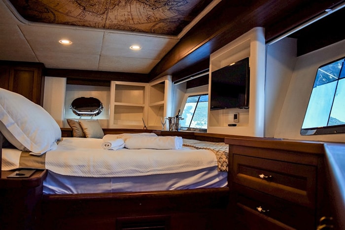 The yacht’s interior design is bright and airy, with light colored walls and carpeting, rich mahogany furniture, and elegant touches like paintings and small pieces of art. Her salon boasts a lounge with two comfortable sofas, entertainment system, and a formal dining area.