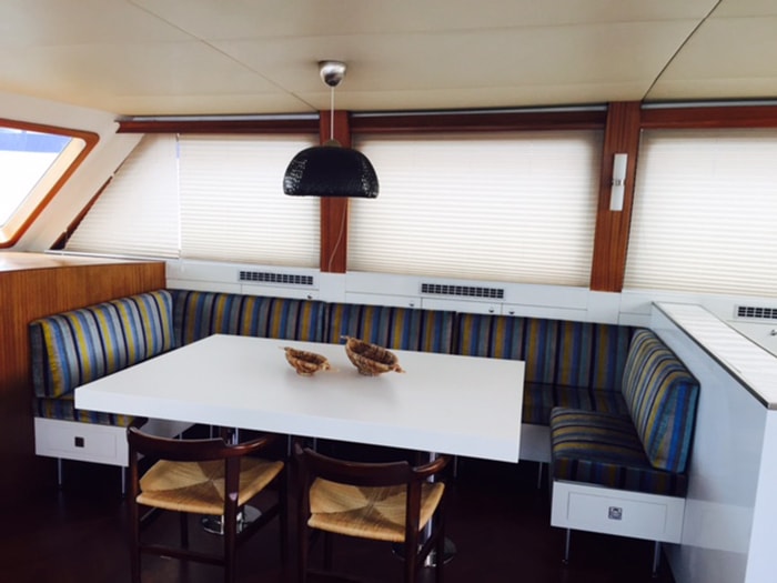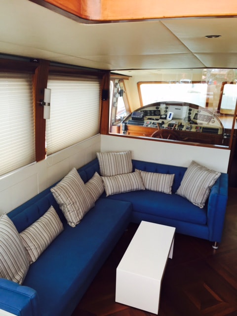 The interior of Yacht Papa Joe is equal parts elegant, comfortable and welcoming. The interior lounge is accessible from both the aft deck and foredeck, and is home to comfortable couches, a large dining table, and a large-screen LCD TV that can turn a full 360° – meaning it can be viewed from both the indoors and the aft deck.