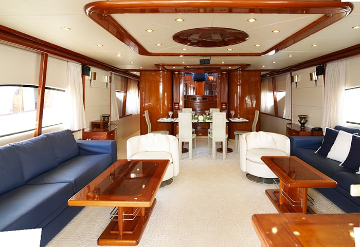 The yacht’s salon includes two large deep blue leather settees with coffee tables, light cream-colored carpeting, and high gloss cherry woods, highlighted by the ample natural light that streams through the large windows. Forward of the salon in an open plan is the formal dining area, complete with a minimalistic clear glass table and high back cream leather chairs.