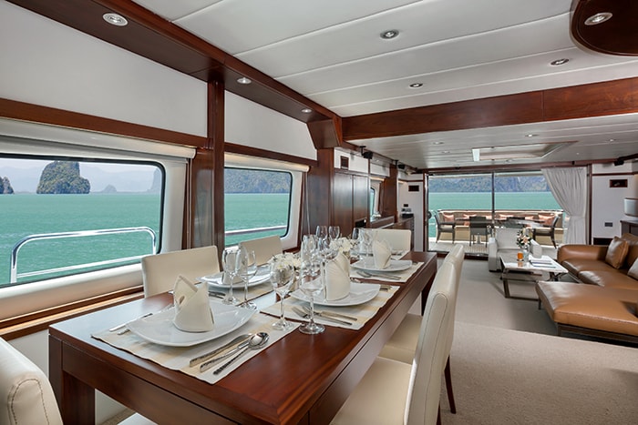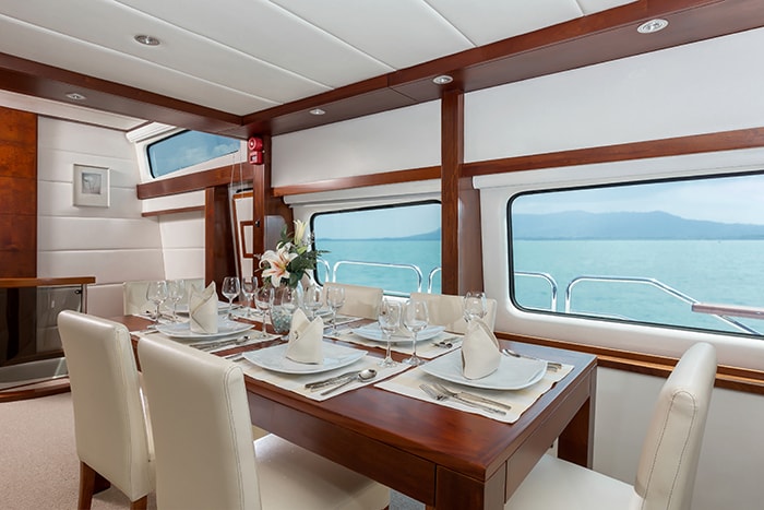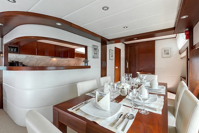 MIA KAI’s interior has a clean and simple theme with neutral beige tones paired with rich dark wood. The yacht’s salon has a comfortable lounge area with large leather sofas, a formal dining table and bar accented by rich mahogany paneling.