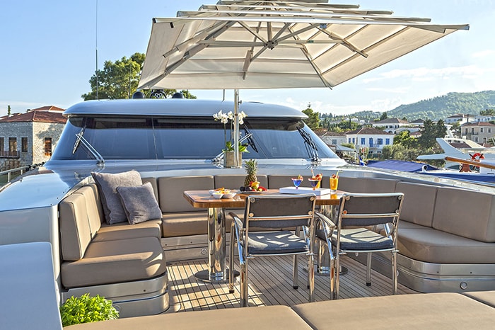 The large open aft deck is a great spot for family and friends to enjoy al fresco dining, or in between meals, to sunbathe on the yacht’s large sun pads. Additional seating can be found on the flybridge, as well as on the bow – where seating and a table is available for guests to use for cocktails or an al fresco lunch. Adventurous charter guests will be excited to know that My Toy has a great range of water sports toys onboard.