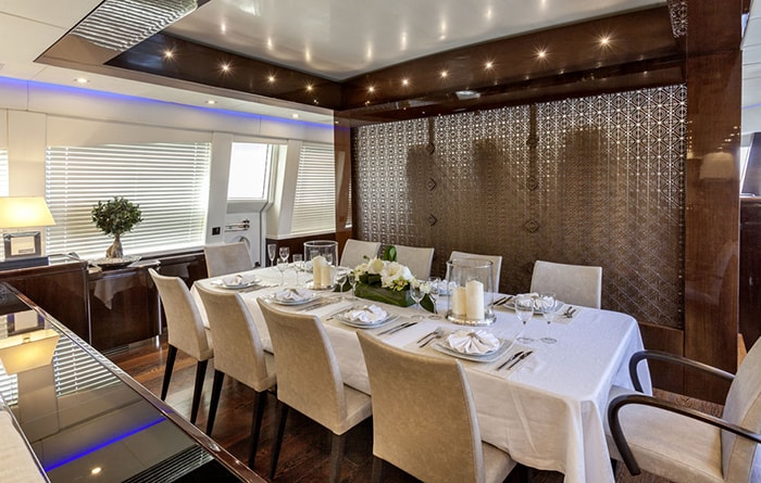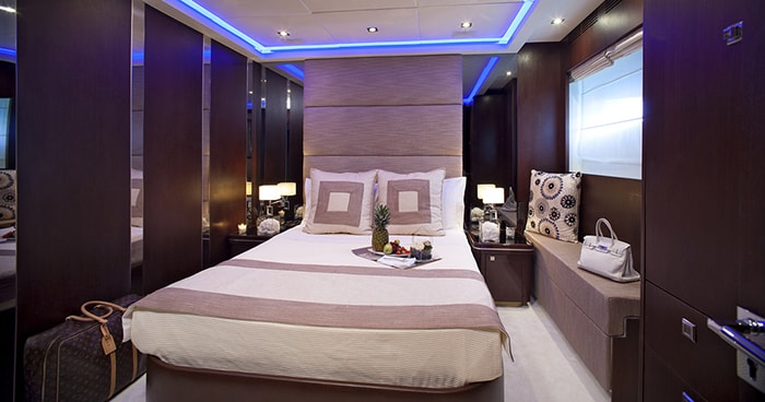 The interior of My Toy is equal parts luxurious, comfortable and extravagant. The subtle, modern and open-plan interior of My Toy sets the perfect backdrop for a relaxing adventure at sea. The salon and dining area is fitted with modern furnishings, as well as the latest audio visual and entertainment systems. Large windows and sliding glass doors surround the main deck, letting in ample amounts of natural light. Adding to its allure, a gym and sauna room are also onboard.