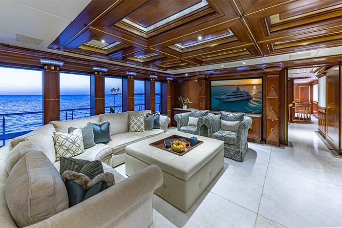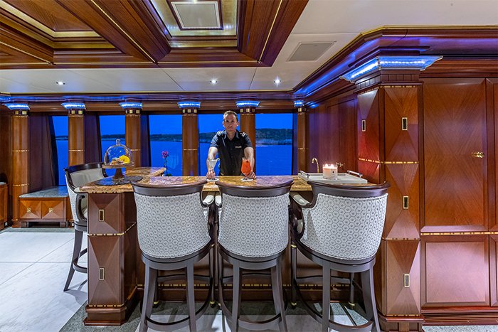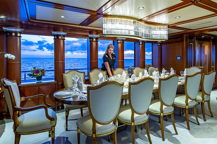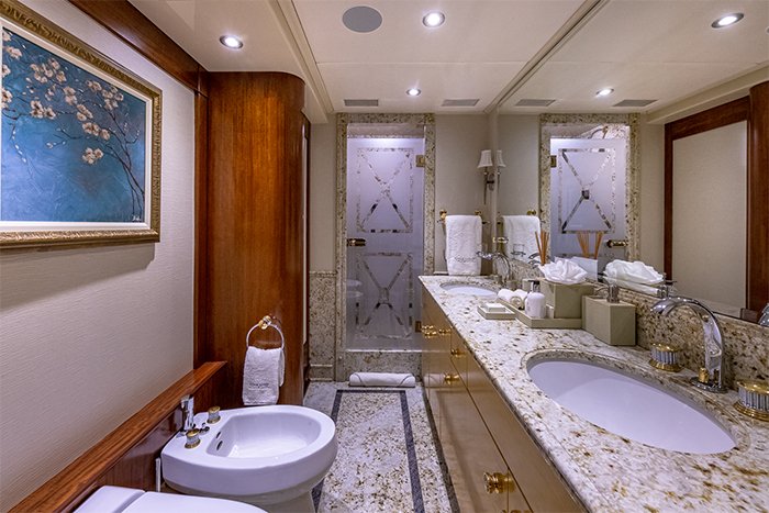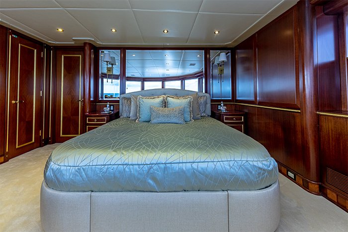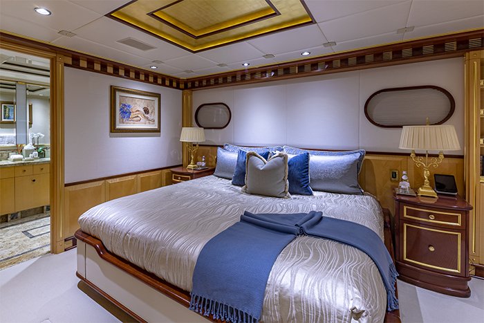 The yacht’s interior living areas are classically-designed and offer comfort and beauty for guests. She features a spacious salon and a formal dining area, perfect for entertaining. The woodwork is beautifully finished and the décor is timeless. Her wide windows allow for excellent views as well as plenty of natural lighting.