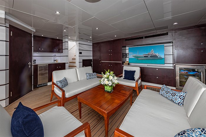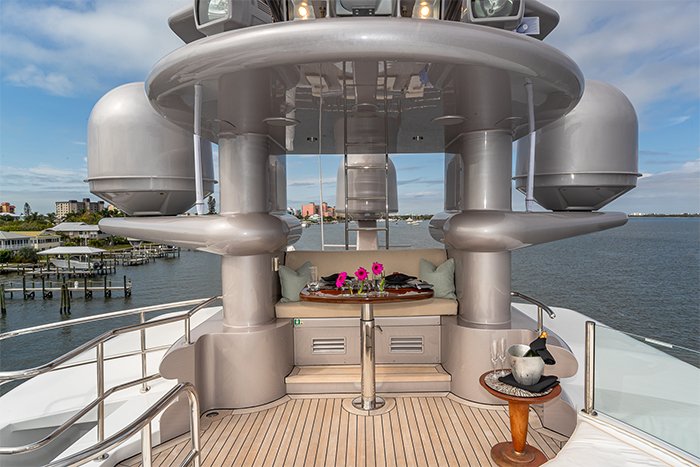 STARSHIP 185 has equally impressive exterior spaces. Her multitude of outdoor living areas allow charter guests the ideal place for relaxation or socializing. The yacht has an amazing dance floor, a gym, ample seating, bars with seating, and an on-deck Jacuzzi.