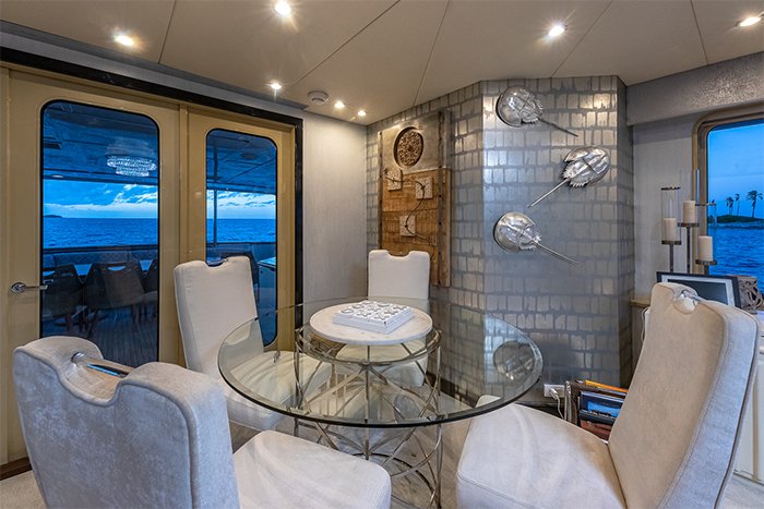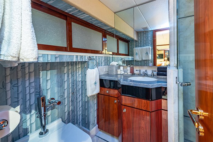 SWEET ESCAPE’s Art Deco inspired interior is stylish yet comfortable. Her large main salon has ample seating, a piano, and a full entertainment system with Bose surround sound, making it the perfect spot for lounging around following a busy day on the water. The formal dining area is adjacent to the main salon and features a large wine cooler filled with select wine. And if you are looking for the perfect place for cocktails and conversation, head to the yacht’s skylounge with its cozy seating options and a full bar.