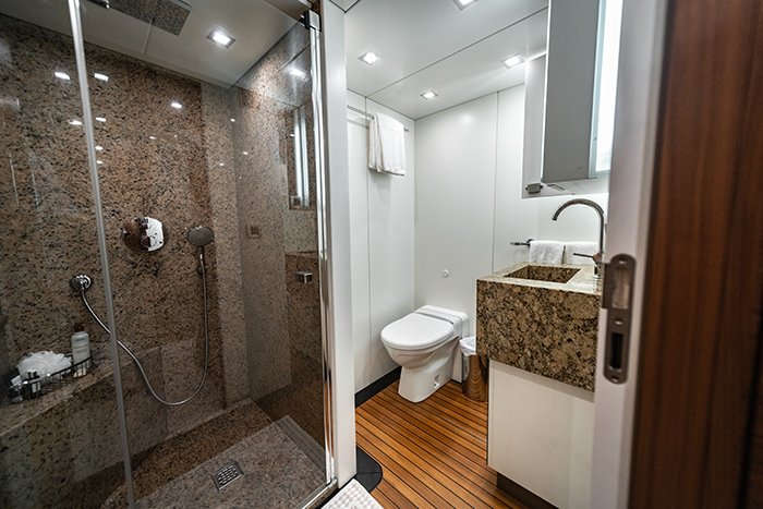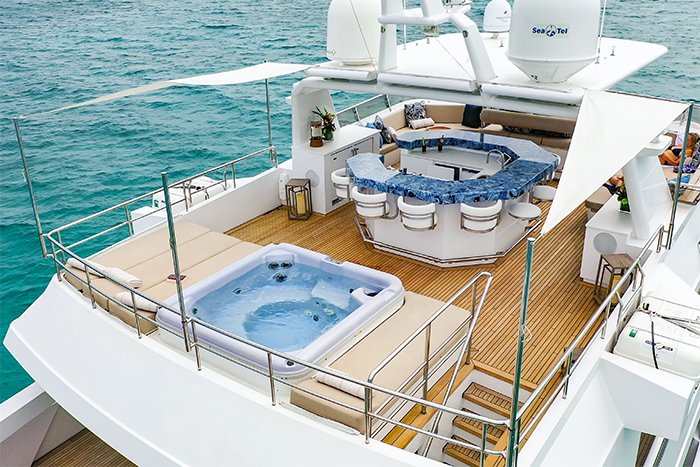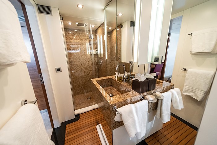 SEA AXIS has ample outdoor deck space with everything you need for dining, relaxing, or having fun. The aft deck, adjacent to the salon, has a lounge area with sofa and coffee table, and a shaded al fresco dining area. The bridge deck has a circular seating area around a fire pit, and sun loungers where you can soak up the rays or curl up with a book. The sundeck features an illuminated blue agate bar with seating, a lounge area with a bird’s eye view of your surroundings, and a Jacuzzi tub for up to 8 guests that is surrounded by sunpads.