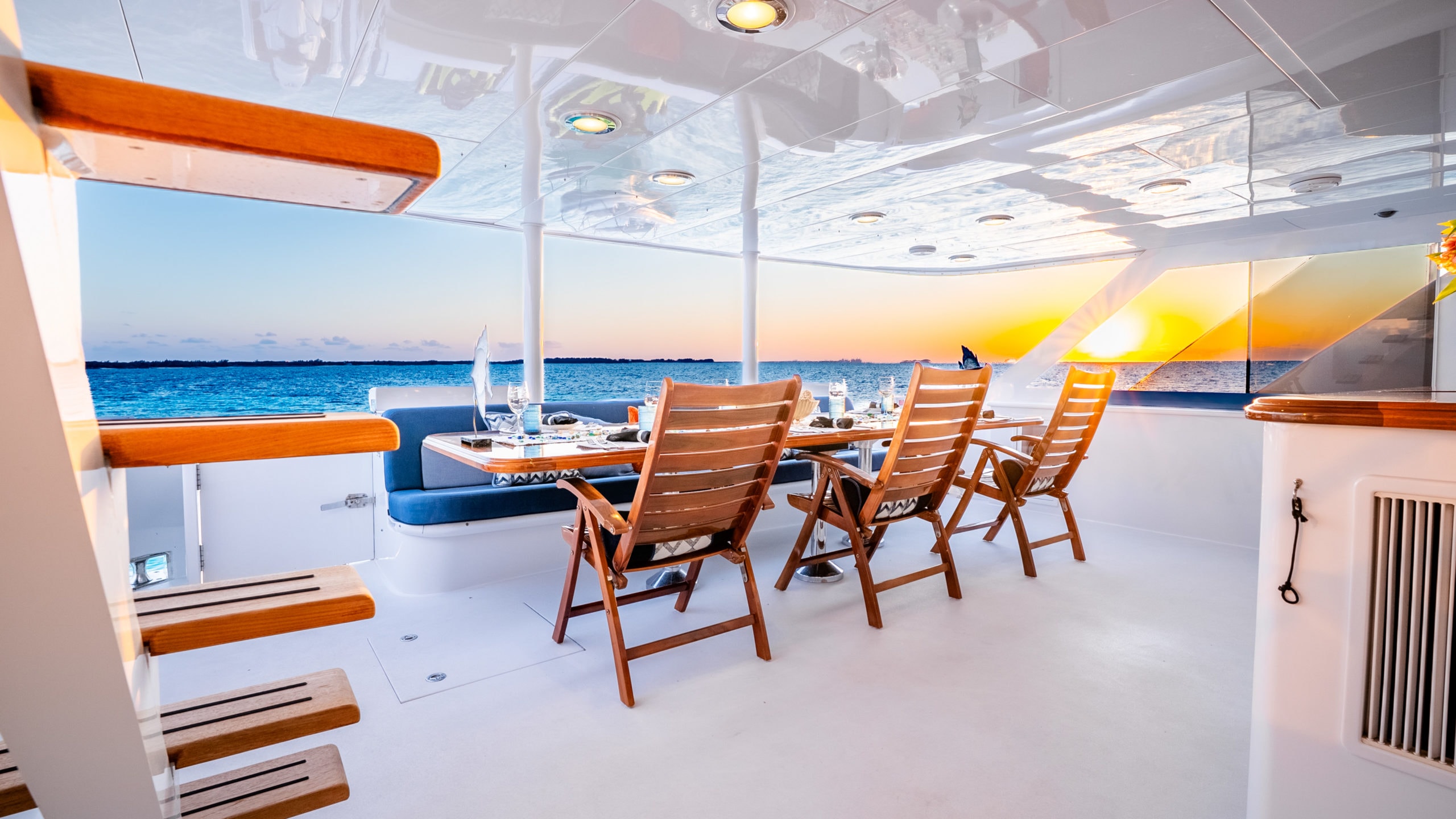 Outdoor living is at the heart of ESCAPE’s design. The flybridge is a standout feature complete with a full bar, a large Jacuzzi, sun loungers, and shaded seating—perfect for soaking up panoramic ocean views. The aft deck offers additional lounge seating and a beautiful area for cocktails or casual dining, while the foredeck provides a more peaceful spot for sunbathing in total privacy.
