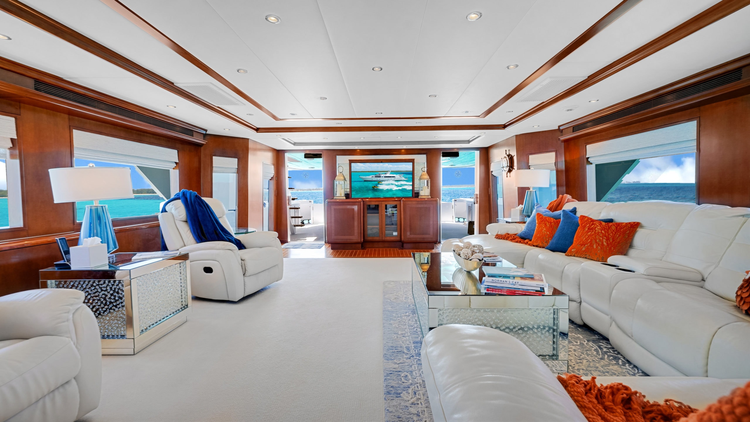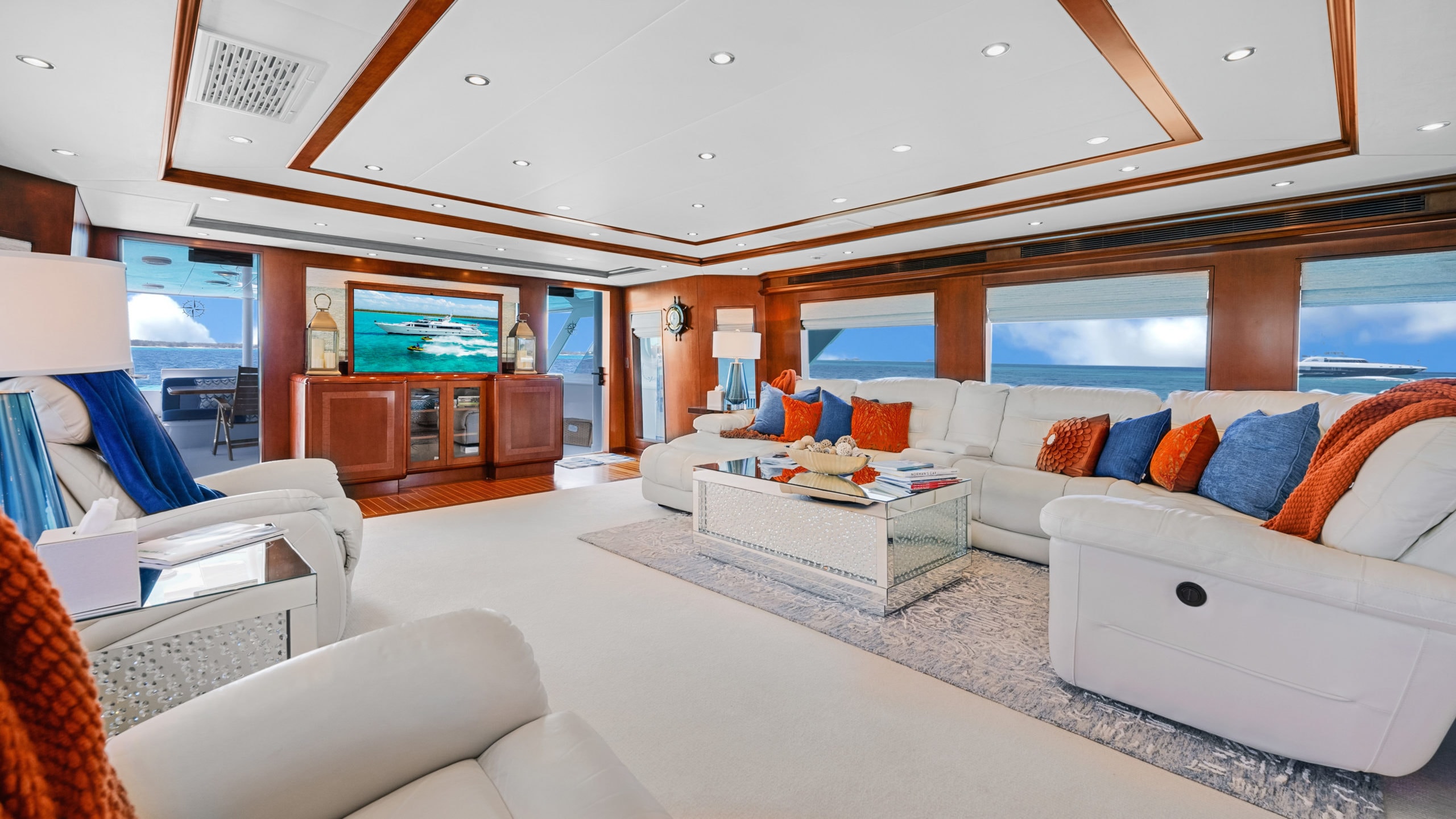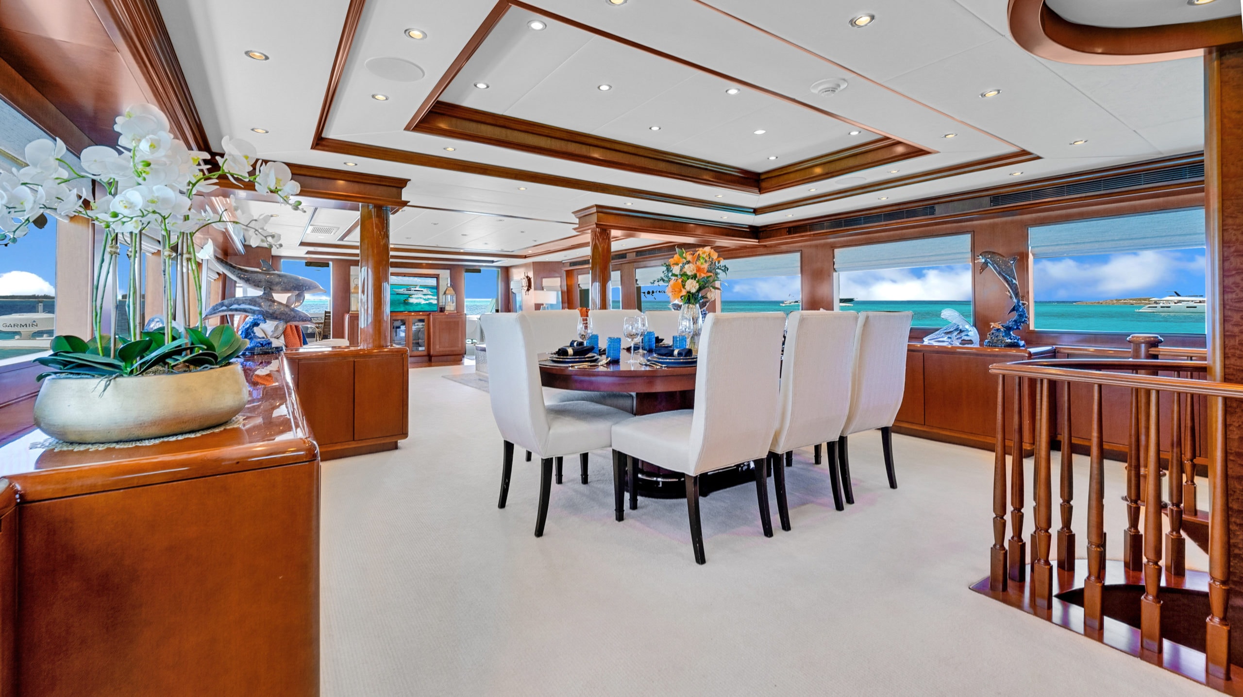 The interior on Yacht ESCAPE, designed with rich wood accents, plush furnishings, and thoughtful details, creates a warm and welcoming atmosphere. Large salon windows bathe the space in natural light, and the main salon flows seamlessly into the formal dining area, creating a harmonious setting for entertaining.