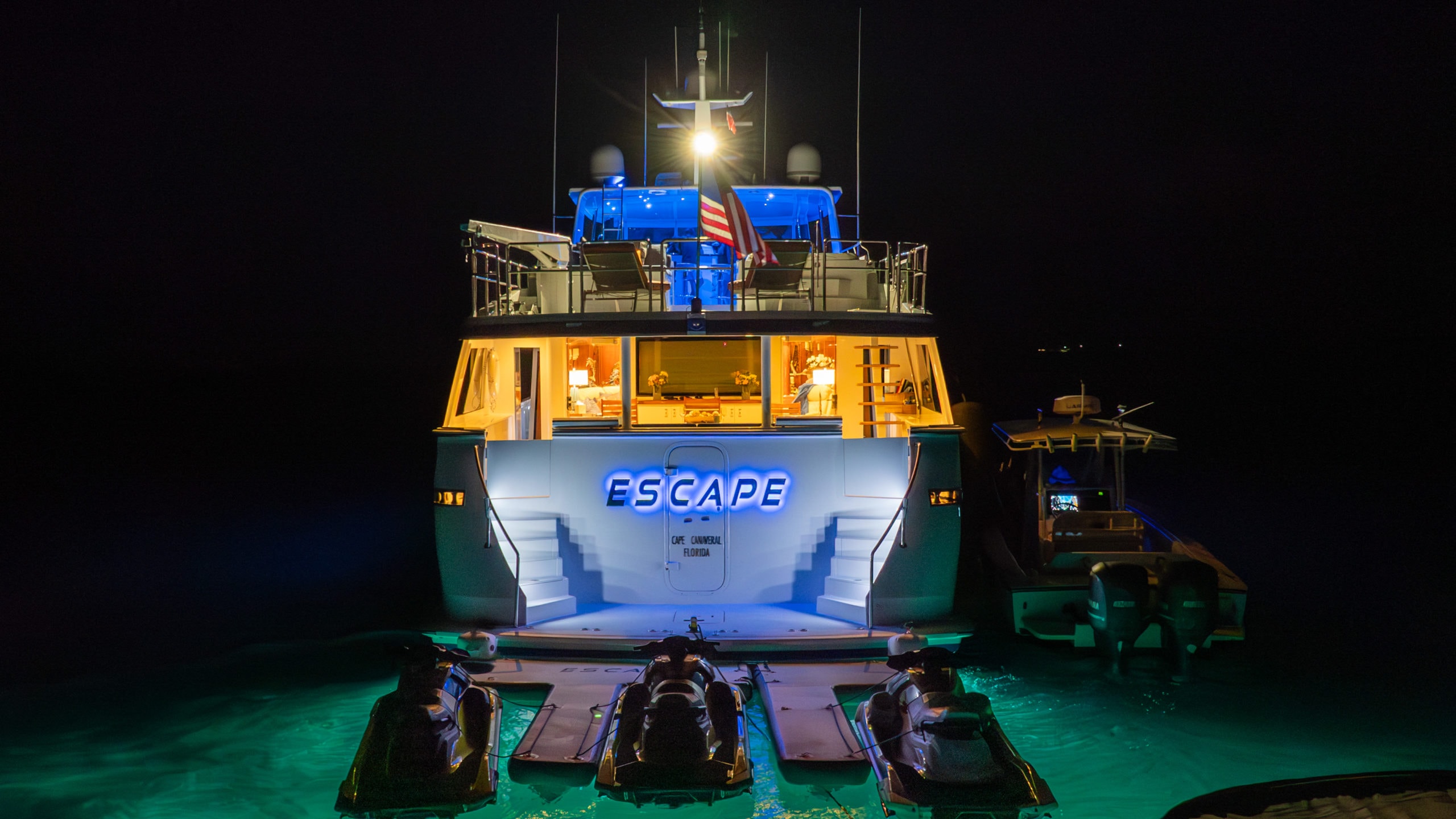 A spacious swim platform on Yacht ESCAPE ensures effortless access to the water—whether diving in for a swim, stepping ashore via tender, or launching an exciting array of water toys, including jet skis, paddleboards, and underwater scooters.
