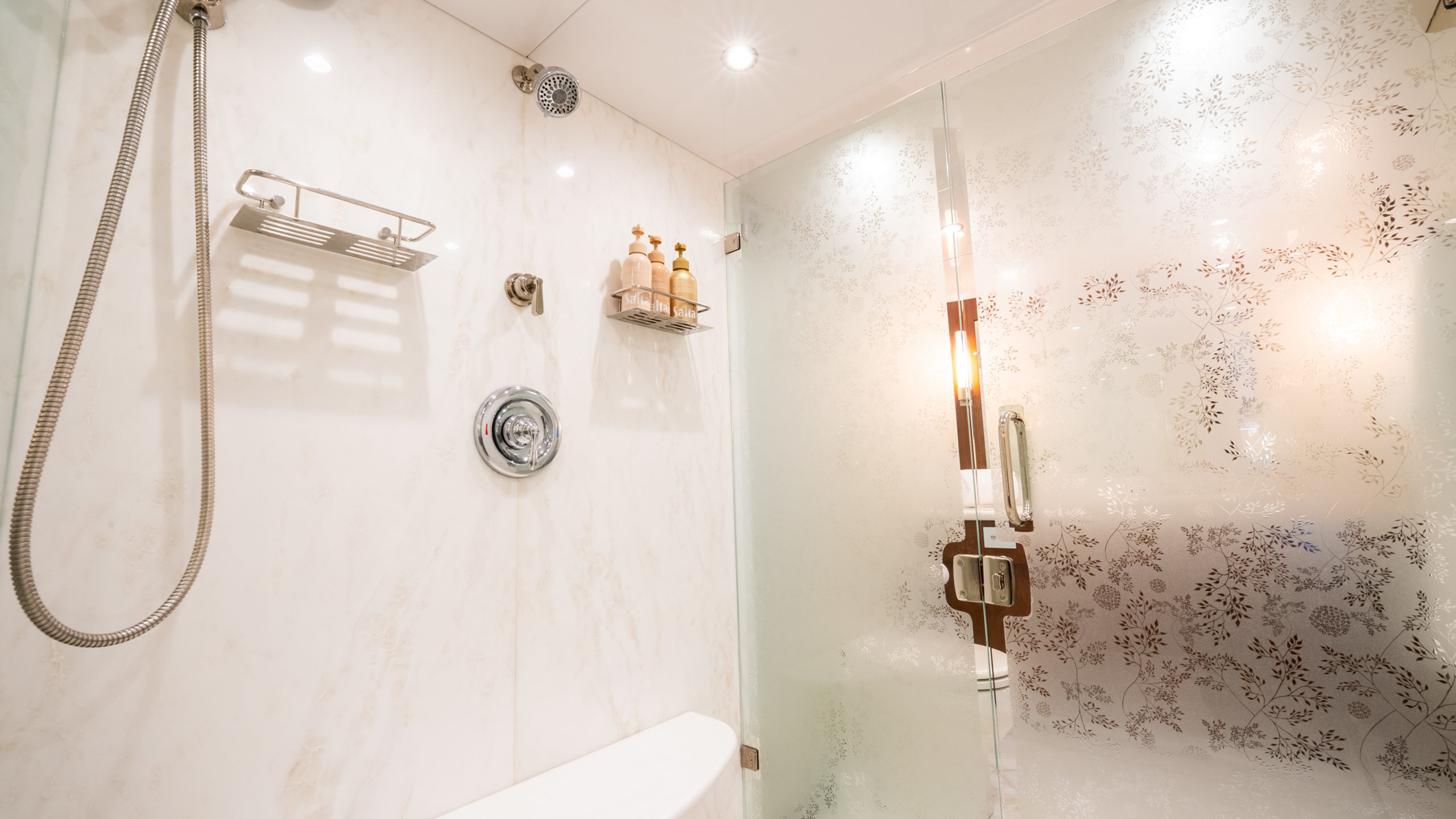 Full-beam Master King Stateroom located below deck with private staircase, walk-in closet, and spacious en suite featuring a rain shower and Jack-and-Jill design with frosted glass.