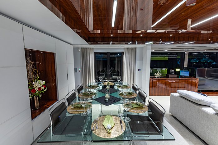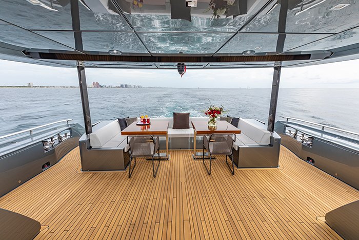 The expansive sundeck provides a great area for entertainment, offering lounge spaces and a wet bar. Alfresco dining is found on both the main deck aft and the covered flybridge. Another great feature on this vessel is the hideaway jacuzzi located on the bow which can be closed away from sight and used as a seating area, or opened up for use to truly enjoy la dolce vita!