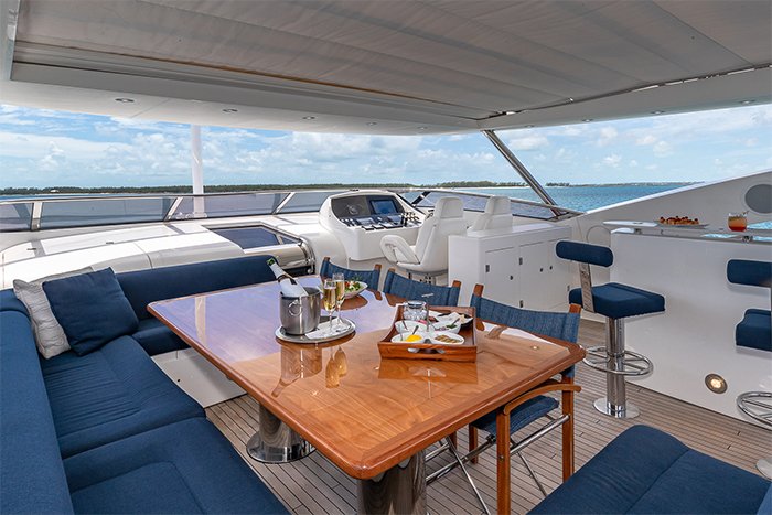Yacht EMRYS has a number of outdoor options for entertaining and relaxing. There are two alfresco dining areas: a shaded one on the aft deck, and the other offering panoramic views on the flybridge. The flybridge also has a retractable roof, a 5-person jacuzzi, a bar with three stools, and an oversized sunbed. This provides the perfect versatility for cocktails under the stars or sunbathing in style. The bow also has a second sunbed for guests to enjoy a more private experience.