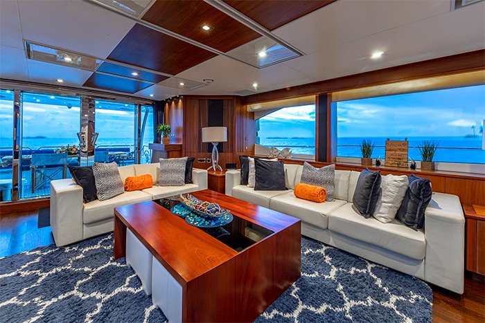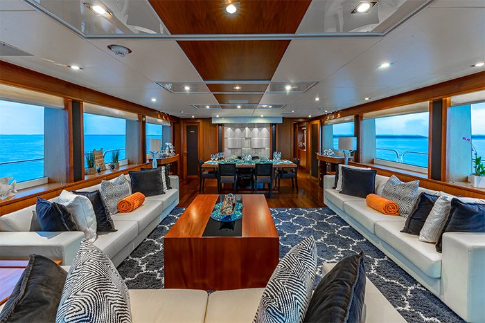 Indoors, the main salon on Yacht EMRYS features warm walnut floors accented by white leather sofas and a large sleek coffee table. The accent colors blue and orange, are carried throughout the entire vessel. Forward is the formal dining area with seating for up to 8 guests. The entire main salon is surrounded by large windows, providing an abundance of natural light and beautiful views.