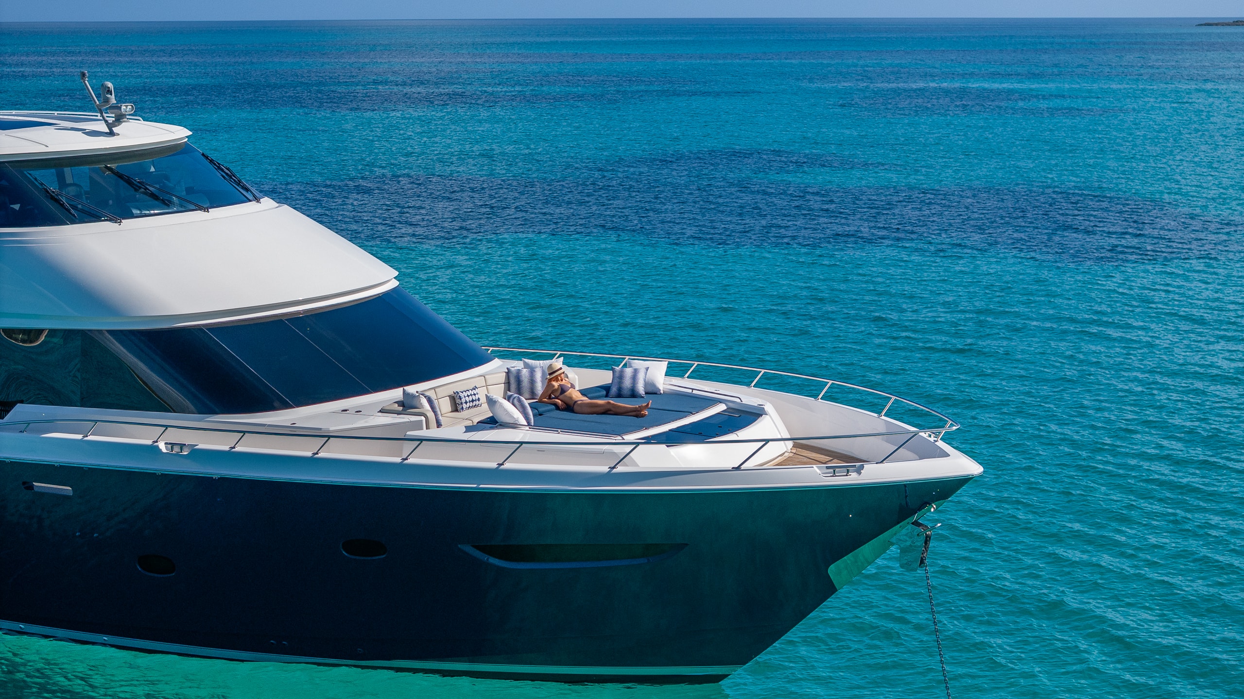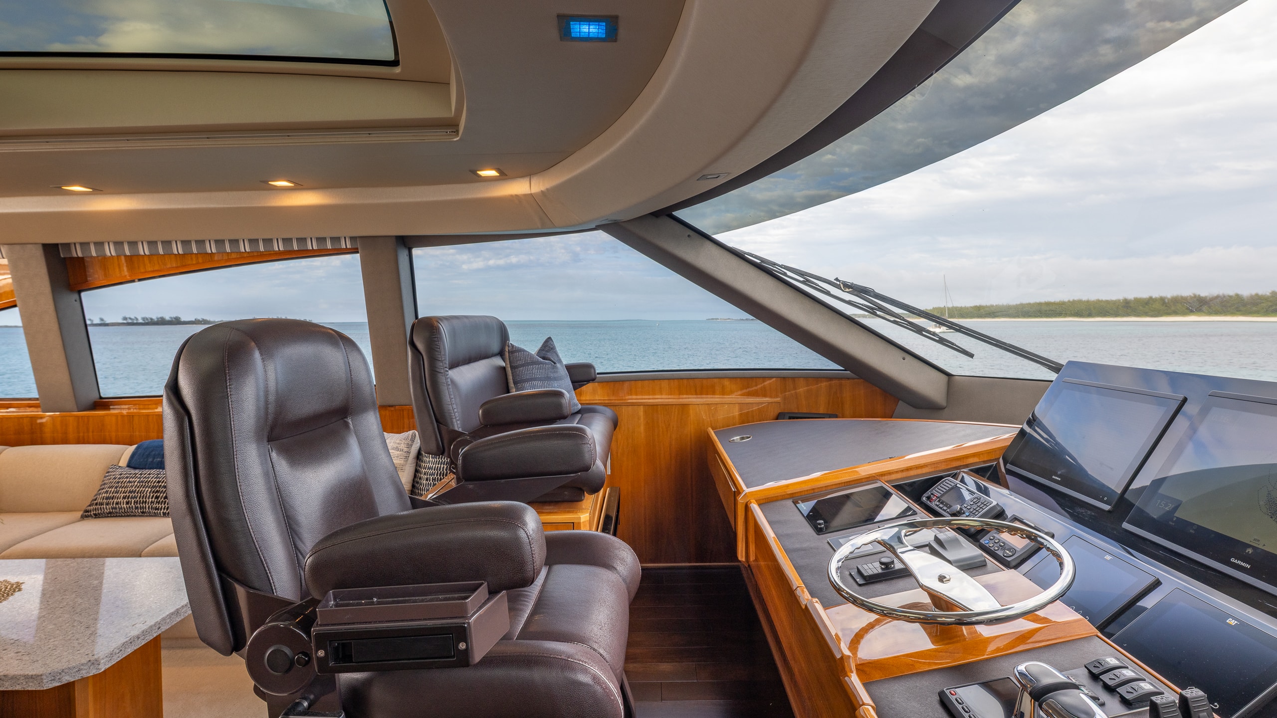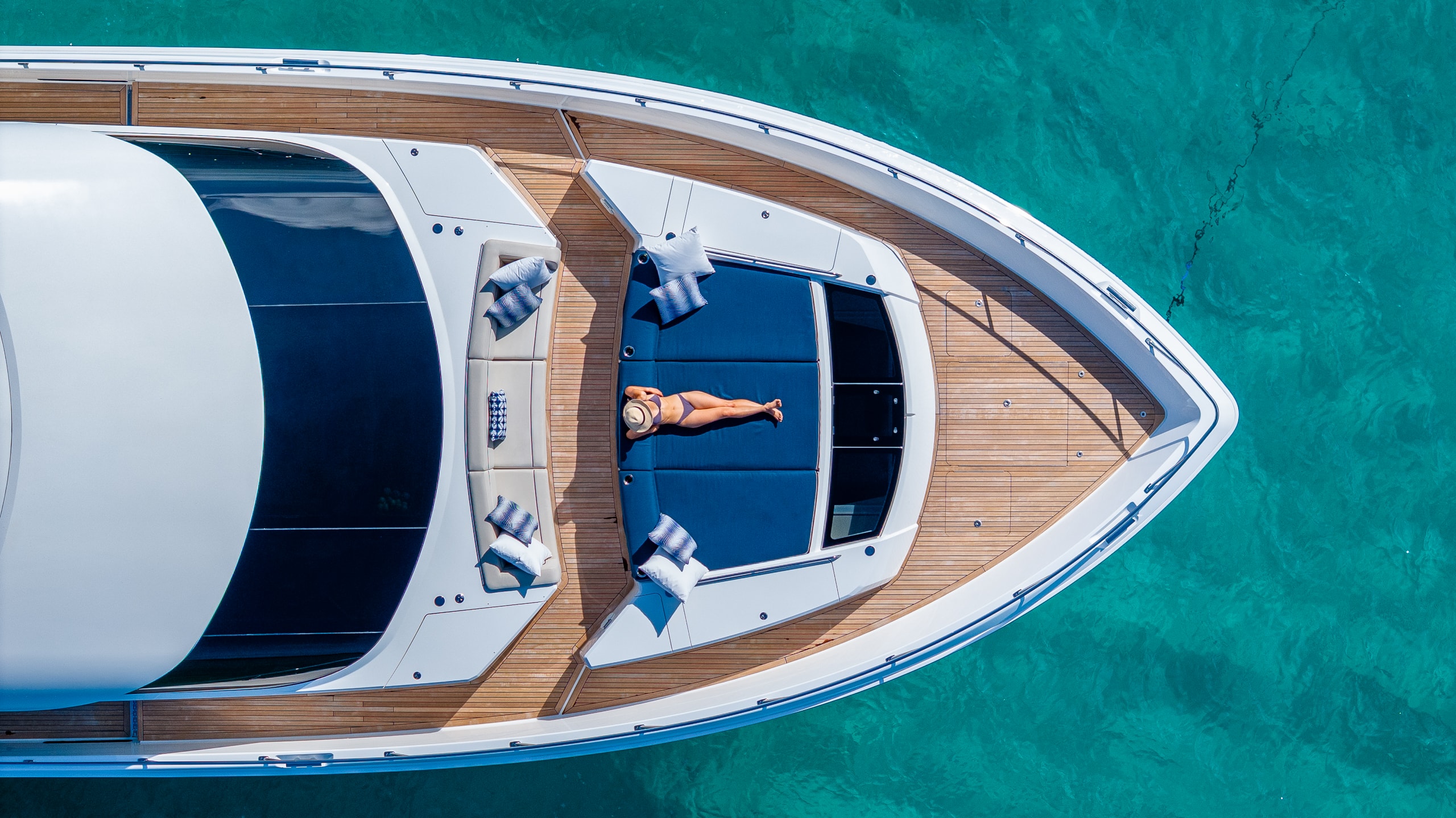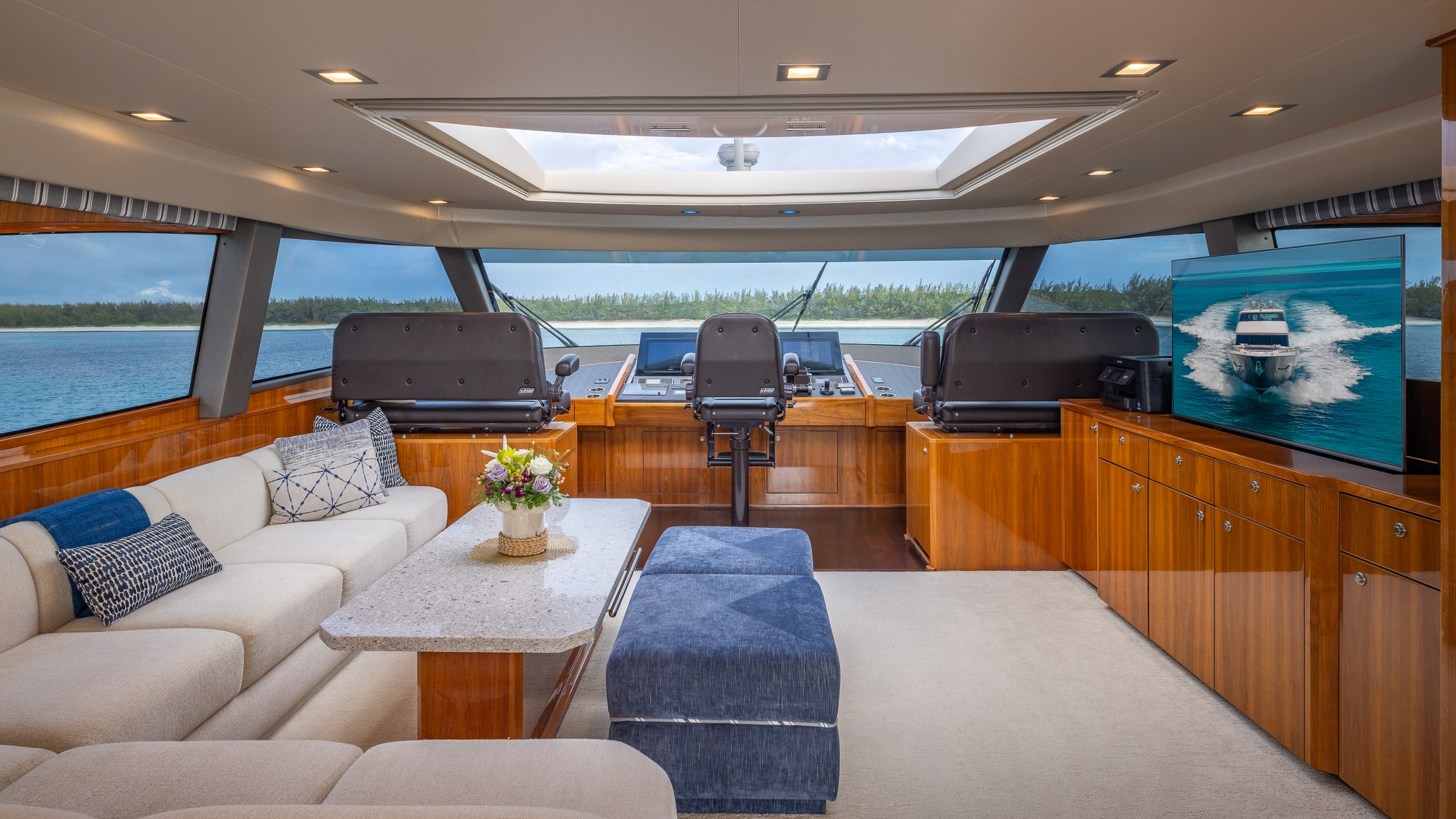 On deck, the expansive flybridge invites days of lounging, dining alfresco, or sipping cocktails under the stars, complete with a wet bar, grill, and panoramic views. The aft deck offers a comfortable space for casual gatherings, while the hydraulic swim platform provides effortless access to the water and water toys.