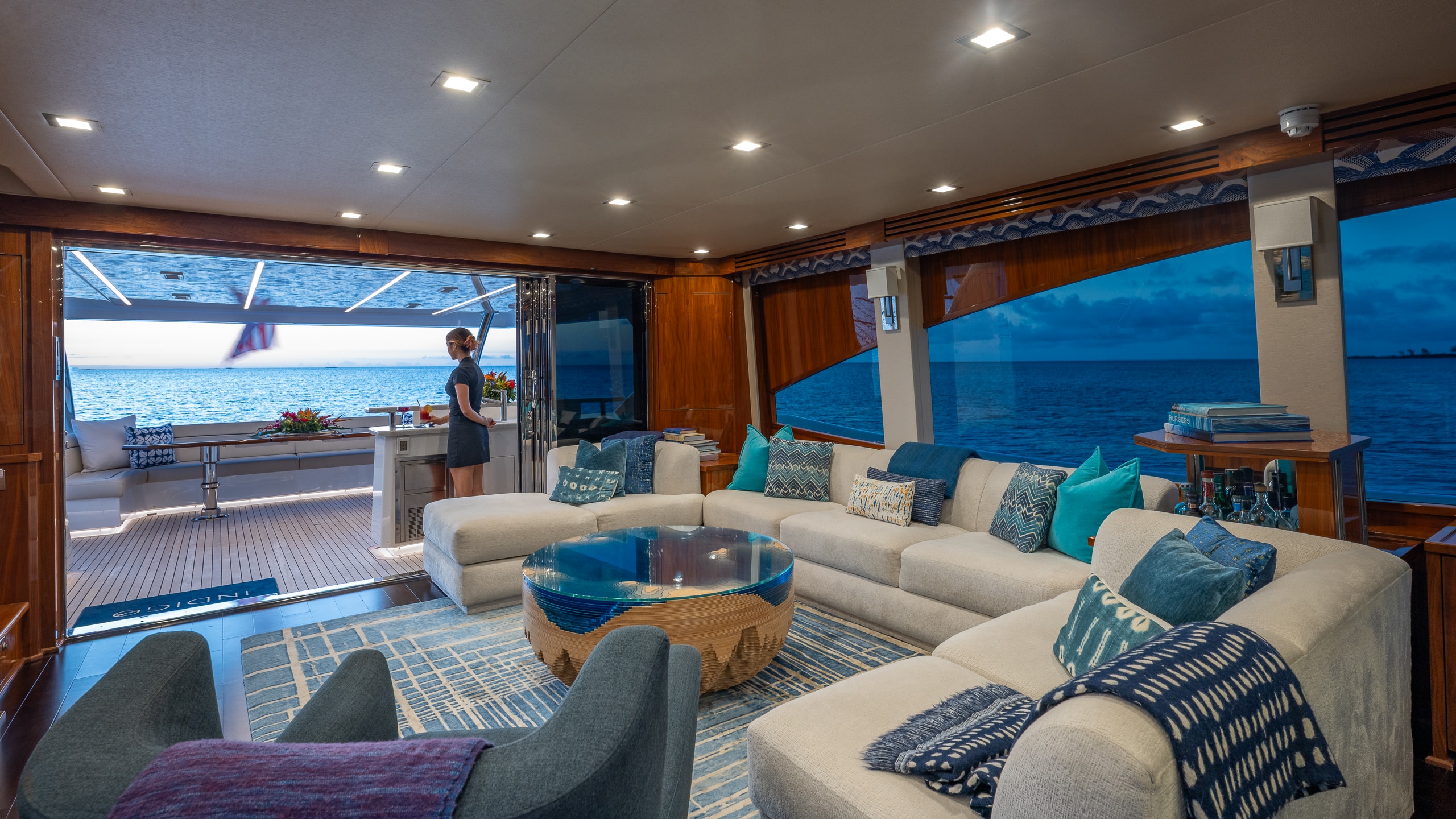 The interior of INDIGO welcomes guests with a salon flooded with natural light, contemporary off-white furnishings accented with elegant shades of blue, and a seamless flow into the formal dining area — ideal for entertaining or relaxing in style. Built as a factory display model, she showcases exceptional attention to detail throughout. Her generous 24-foot beam provides expansive interior volume, rivaling that of 100-foot yachts. INDIGO comfortably accommodates up to eight guests in four luxurious staterooms, including a full-beam master suite, a spacious VIP cabin, and two versatile twin cabins, each designed with refined finishes and ensuite bathrooms.