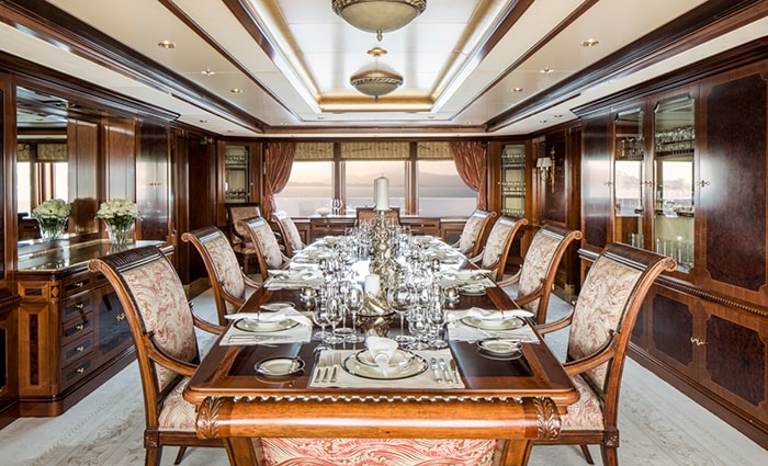 Her classically elegant interior is punctuated by rich woods, luxuriant fabrics, and full-length windows. All the decks are accessible via elevator. Entertaining spaces include the lounge with its selection of sofas and large chairs, and the lavish formal dining room.