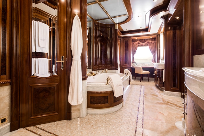 TITANIA’s exterior deck space features a sundeck with a large Jacuzzi, sports bar, theater, fully equipped gym with fitness instructor, and spa with massage room. She also has a beach club with sauna, which can be converted into a nightclub. Her bridge deck and upper deck both feature al fresco dining options.