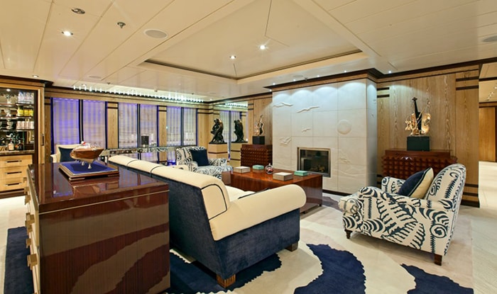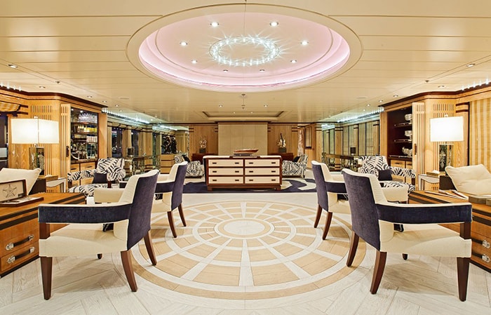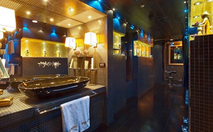 FORCE BLUE has a number of interior entertaining options. Her main deck salon has a large lounge area with sofas, chairs, coffee tables and a games table. There is a separate formal dining room. The Owner’s deck has a sky lounge, perfect for cocktails and hors d’oeuvres, and a cinema room. She also offers the ultimate spa experience, and has a salon, steam shower, hammam, mud bath, sauna, Jacuzzi, hydro massage, massage room, and fully equipped gym. An elevator connects the decks.