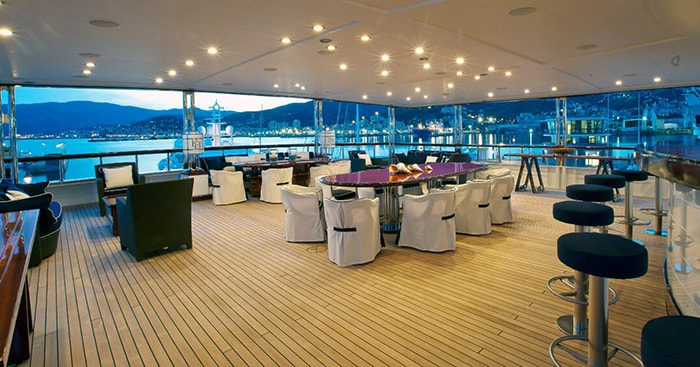 Her vast exterior deck space allows you to entertain large groups, capable of hosting receptions for up to 350 guests. The upper deck has an al fresco dining area for 60 guests which can be transformed into a nightclub after dinner, complete with professional DJ equipment, strobe lights and full sound system.