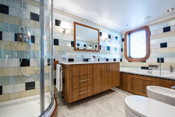A Master cabin with King size bed, private terrace, en suite, and lounge/study. The lounge/study is convertible to a Double cabin with its own en suite.