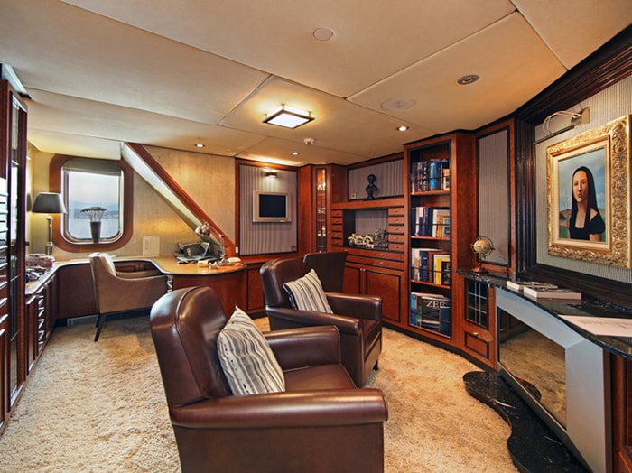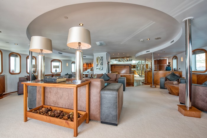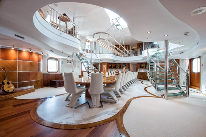 The yacht’s interior is stylish yet cozy. The main salon is divided into two areas: a dining space and a lounge. The dining area has a table with seating for 22 guests, located directly below an atrium where you can see all the way to the top of the yacht. The lounge is perfect for relaxing with sofas, armchairs, a fireplace, a bar, and grand piano.
