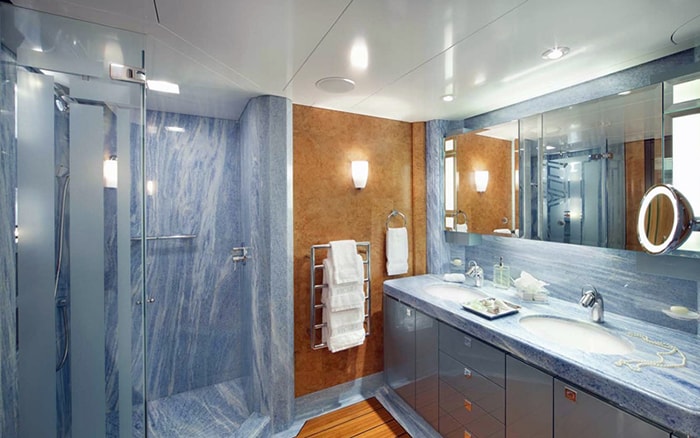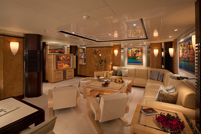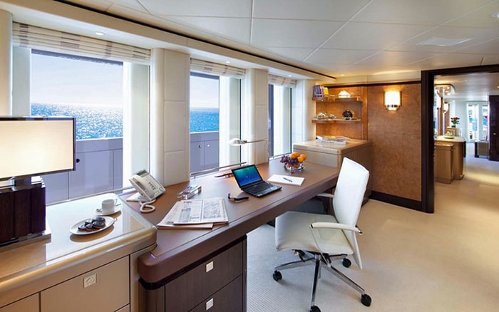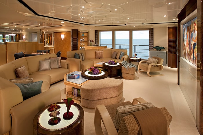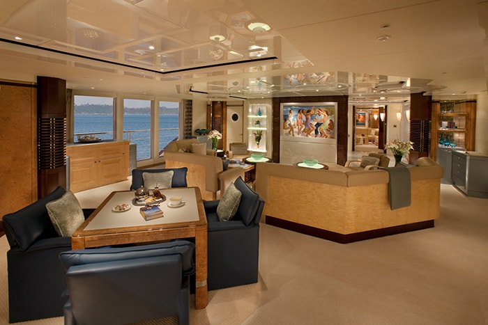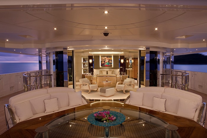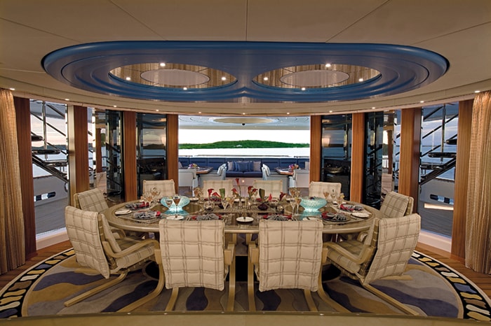 The yacht’s main deck has a flexible indoor/outdoor layout that is perfect for entertaining. Tables can be rearranged into four different configurations, seating up to 24 people for dinner. Just inside the glass doors from the aft deck is the main salon, which has another dining table for 12 guests. Behind that is a bar topped in blue Murano glass. An elevator connects all decks.