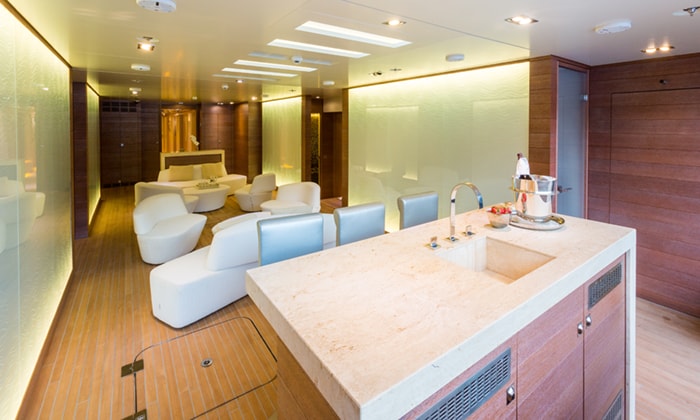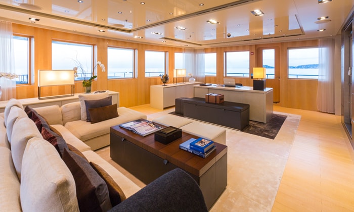 The yacht’s skylounge offers an additional room for sharing drinks and entertainment, and hosts a bar, expansive seating and a dining table, while an upper office surrounded by windows provides the perfect place to enjoy the quiet solitude.