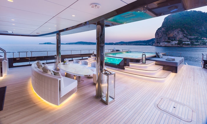 Yacht LOON’s main aft deck holds a 16-foot infinity pool, a spacious poolside seating area, panormas of seascapes, and lights set into the furnishings that add character to the evenings. The upper deck hosts a long built-in seating arrangement and seaside dining area, while her bridge deck jacuzzi creates a space to enjoy the highest vantage of the Caribbean. A rare feature, LOON’s extended beach club, provides ample space for sunbathing in lounge chairs, relaxing in the shade, and jumping in for a swim. This deck also leads to a gym with state-of-the-art exercise equipment, a sauna, and a large six-person Hammam (steam room) that completes the ultimate yachting dream.