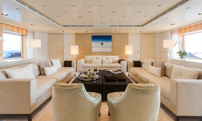 Yacht LOON ’s contemporary elegance invites guests inside spacious interiors for the most memorable times spent with the best of company. Her salon is brilliantly lit and allows for easy conversation near picturesque views of the sea framed through the windows. A formal dining area with deluxe seats around a long oval table can be found next to doors leading to the aft deck.
