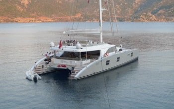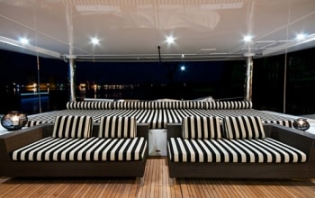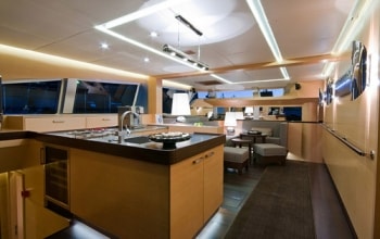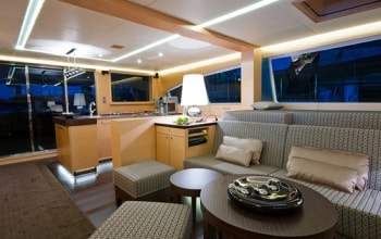 Evoking a warm and romantic atmosphere throughout, the interior of Catamaran Ipharra features contrasting shades of wenge and anegre woods, customized lighting and accents of geometric furniture. Subtle hints of neutral beiges, creams and ivories forms the perfect backdrop for Ipharra’s contemporary décor. Panoramic windows, offering breathtaking views of the sun and sea, surround the spacious main saloon.