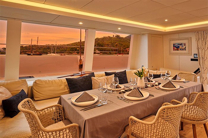 Located on the main deck and adjacent to the salon is an al fresco dining option. The bow terrace has an intimate lounge area where you can enjoy a cocktail and conversation. Guests will love spending time on the flybridge, complete with an al fresco dining area, full wet bar, three large sun loungers.