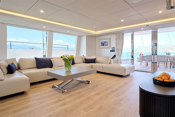 Her contemporary interior living spaces are perfect for entertaining and relaxing. The large central salon opens to both the bow terrace and the cockpit, and features large windows that provide panoramic views. It’s decorated in a palette of crisp white with marine-hued accents. The lounge area has a large L-shaped sofa, entertainment unit and coffee table, while the formal dining area has a table, seating for 10 and a bar. The fully equipped galley is where your chef will create memorable meals or where guests can whip up a quick snack.