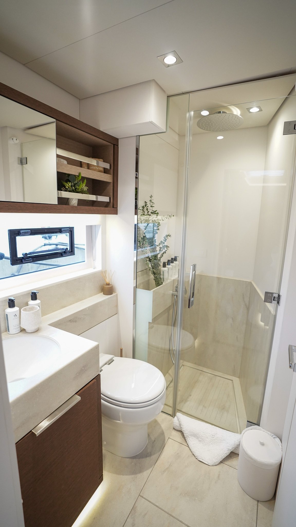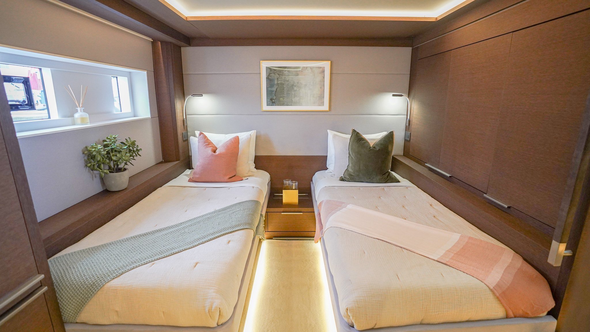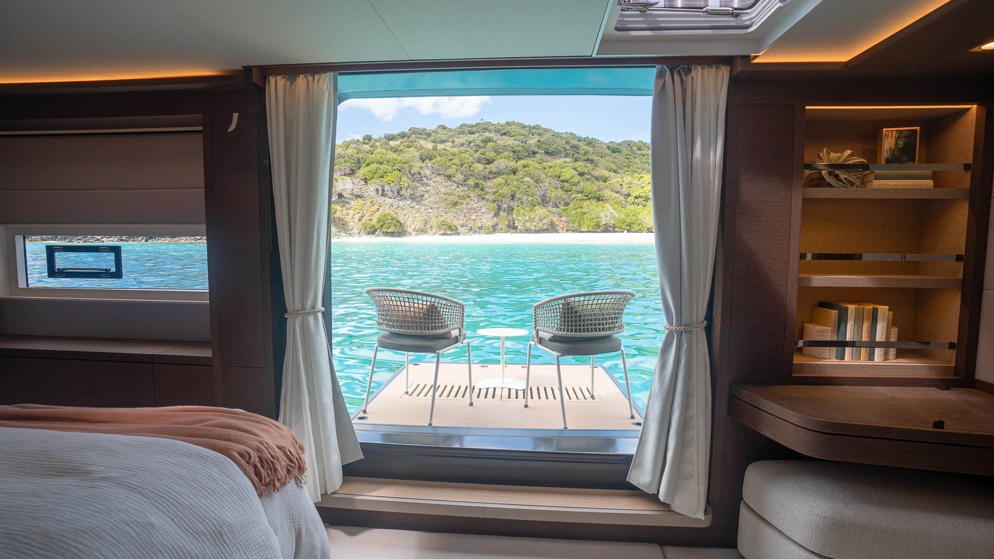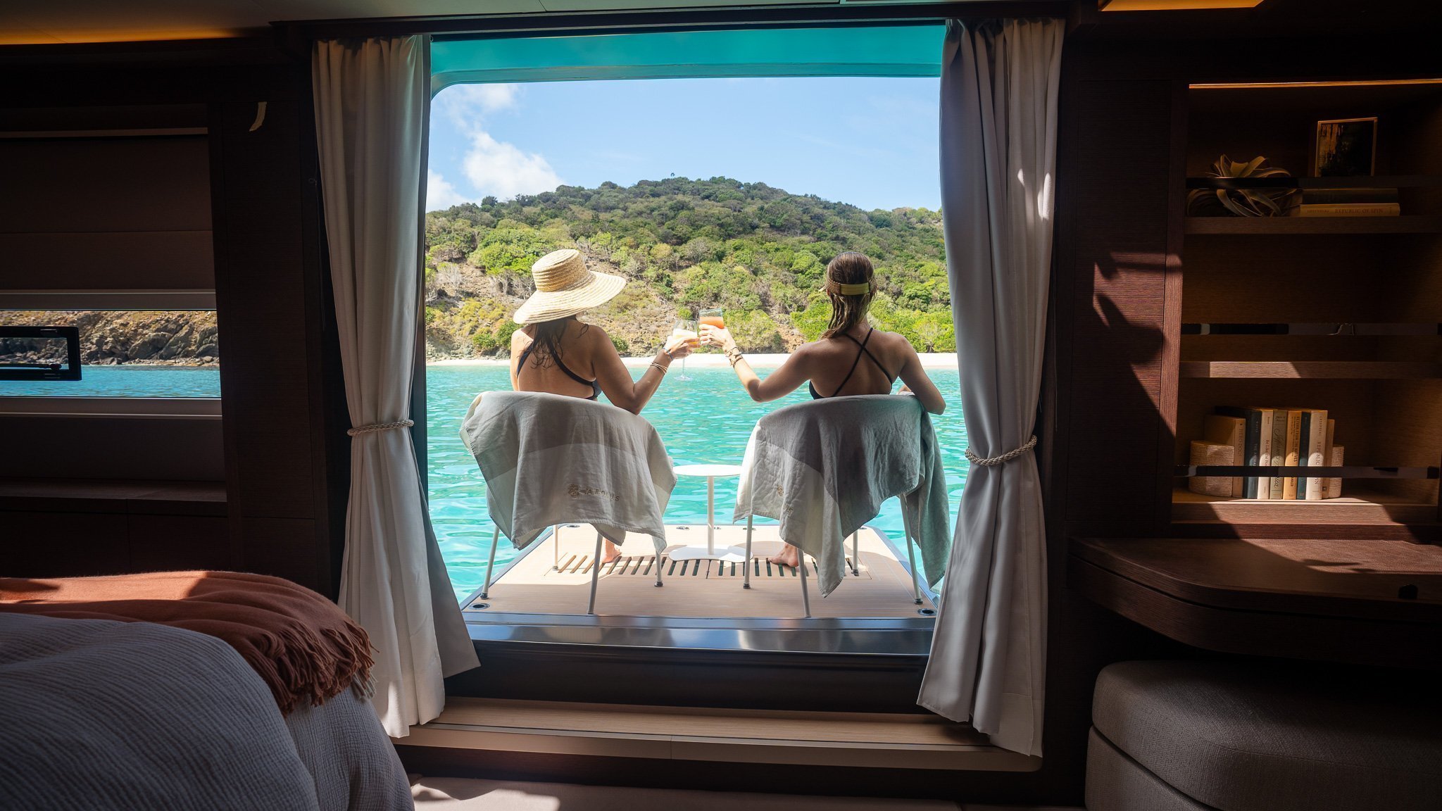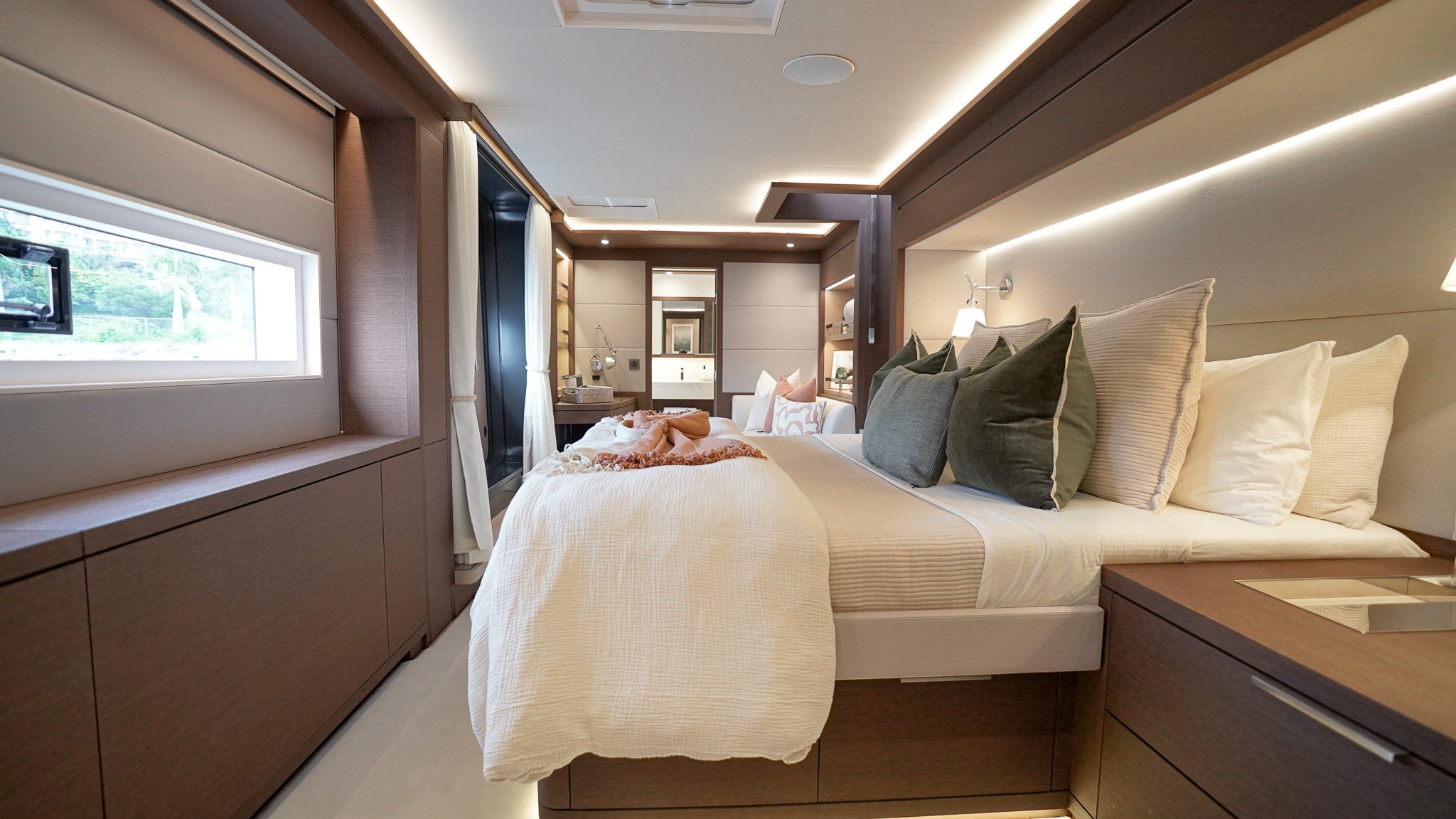 Below deck, Yacht AEOLUS accommodates up to eight guests in four beautifully appointed staterooms, including a full-beam master suite with private access to the deck. Each cabin features ensuite facilities, elegant materials, and thoughtful lighting to create a sense of calm retreat after a day on the water.