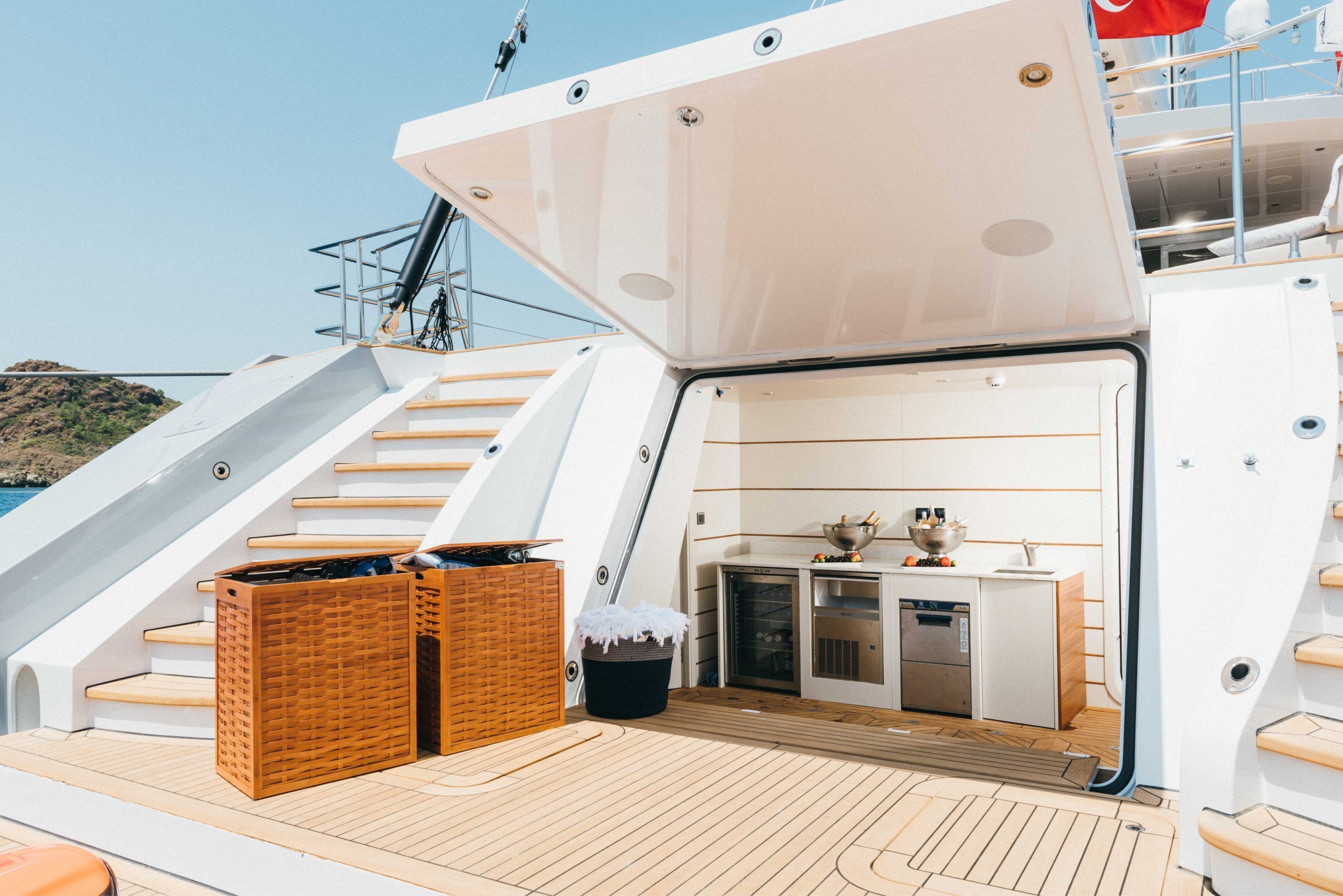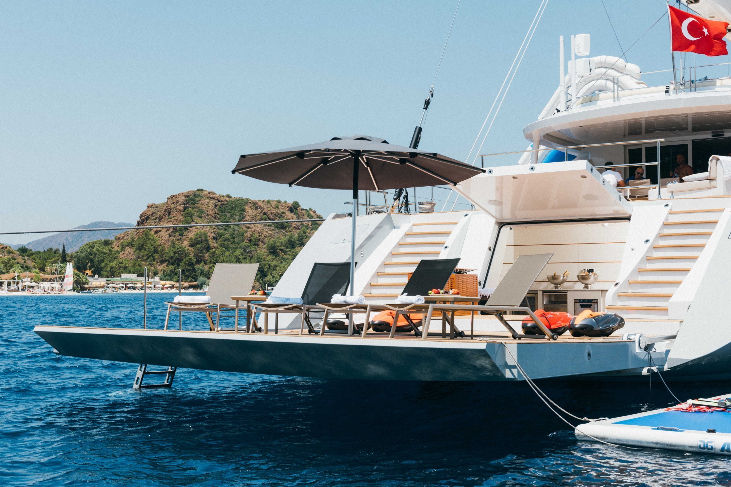 Outside, Yacht All About U 2 offers plenty of space to relax and enjoy the views. The large flybridge is perfect for sunset cocktails, while the expansive aft beach club brings you right to the water’s edge. Carrying a variety of water toys for guests to enjoy, including sea bobs, water skis, wakeboards, and more, Yacht All About U 2 offers the perfect blend of relaxation and adventure.