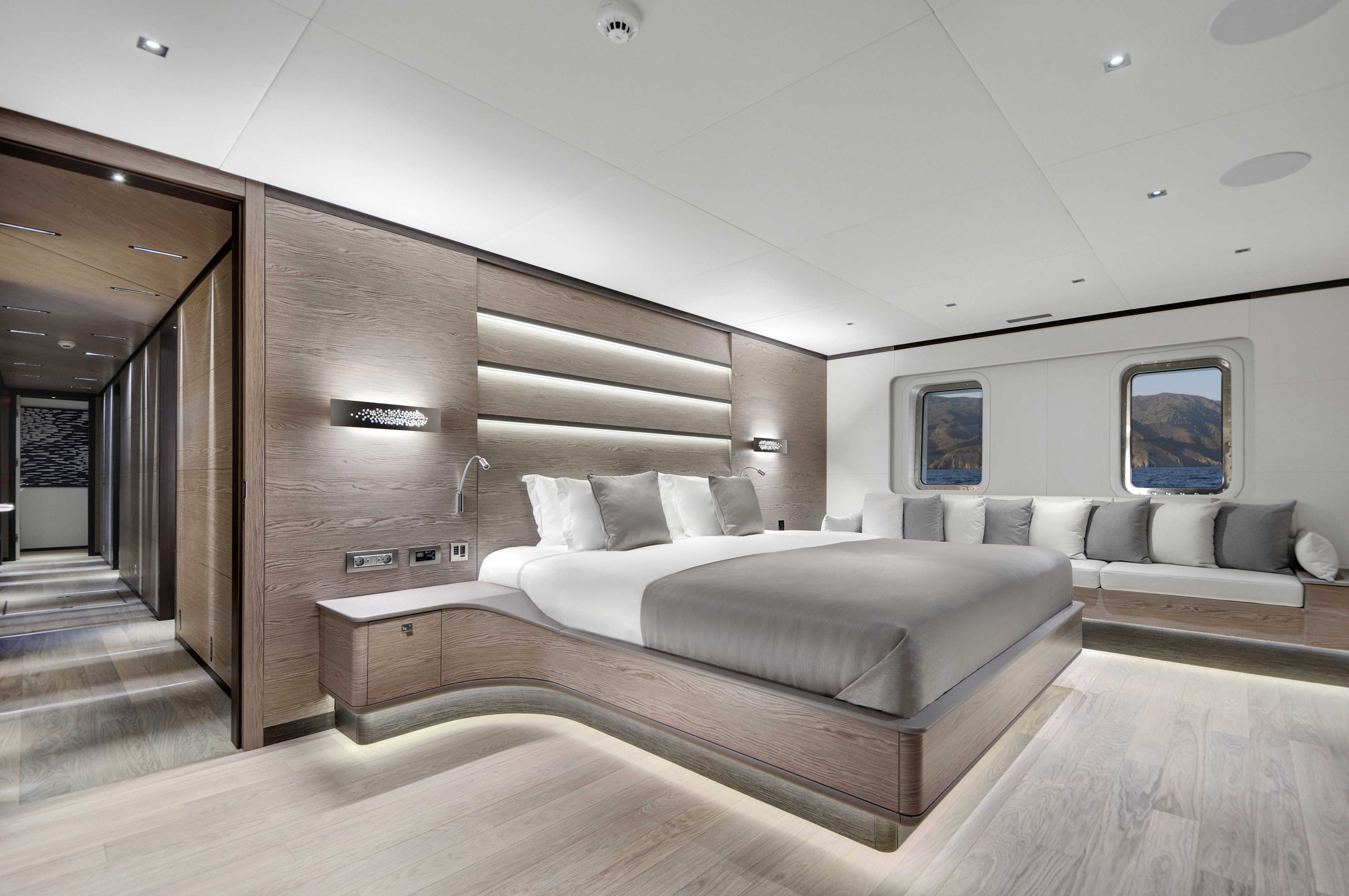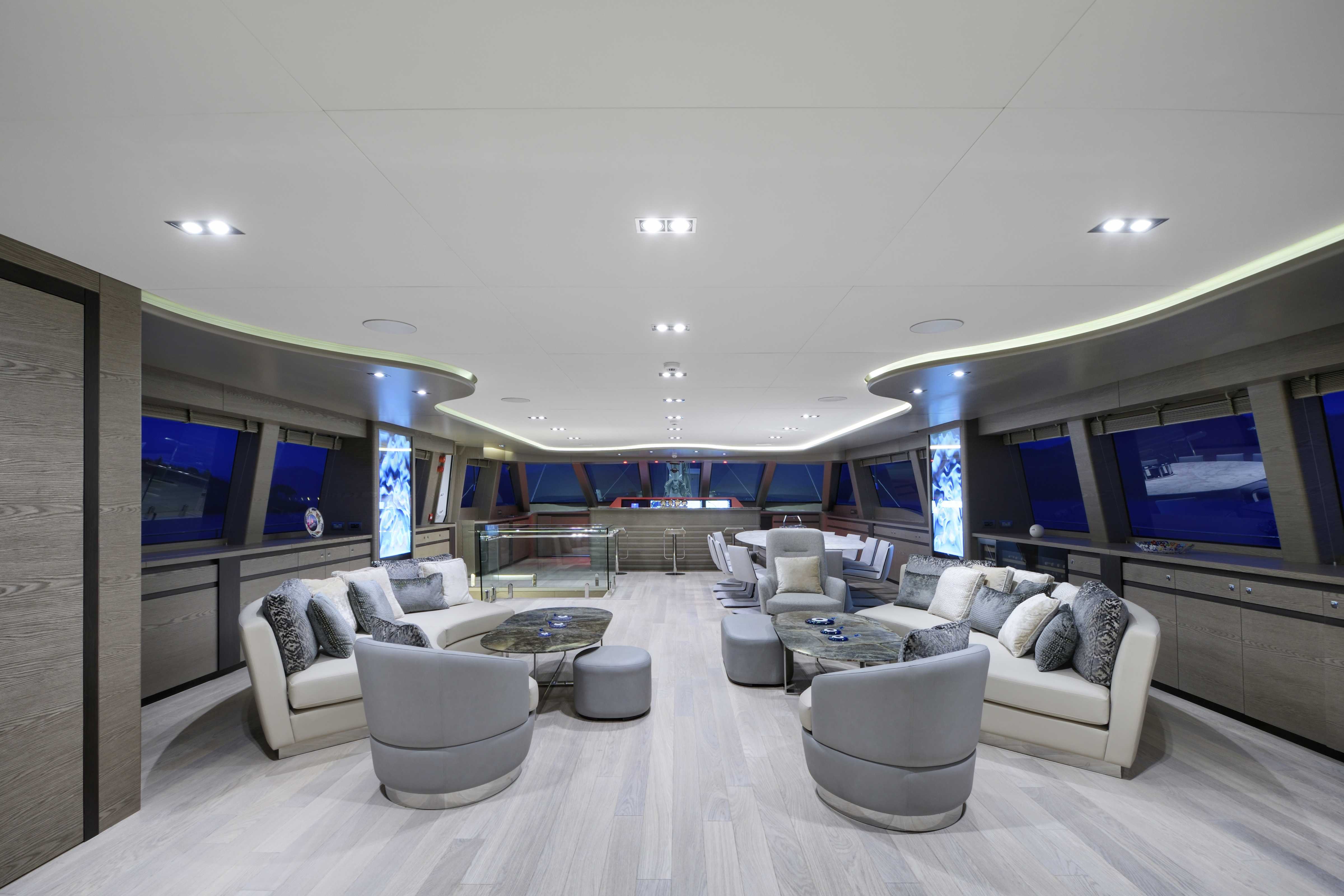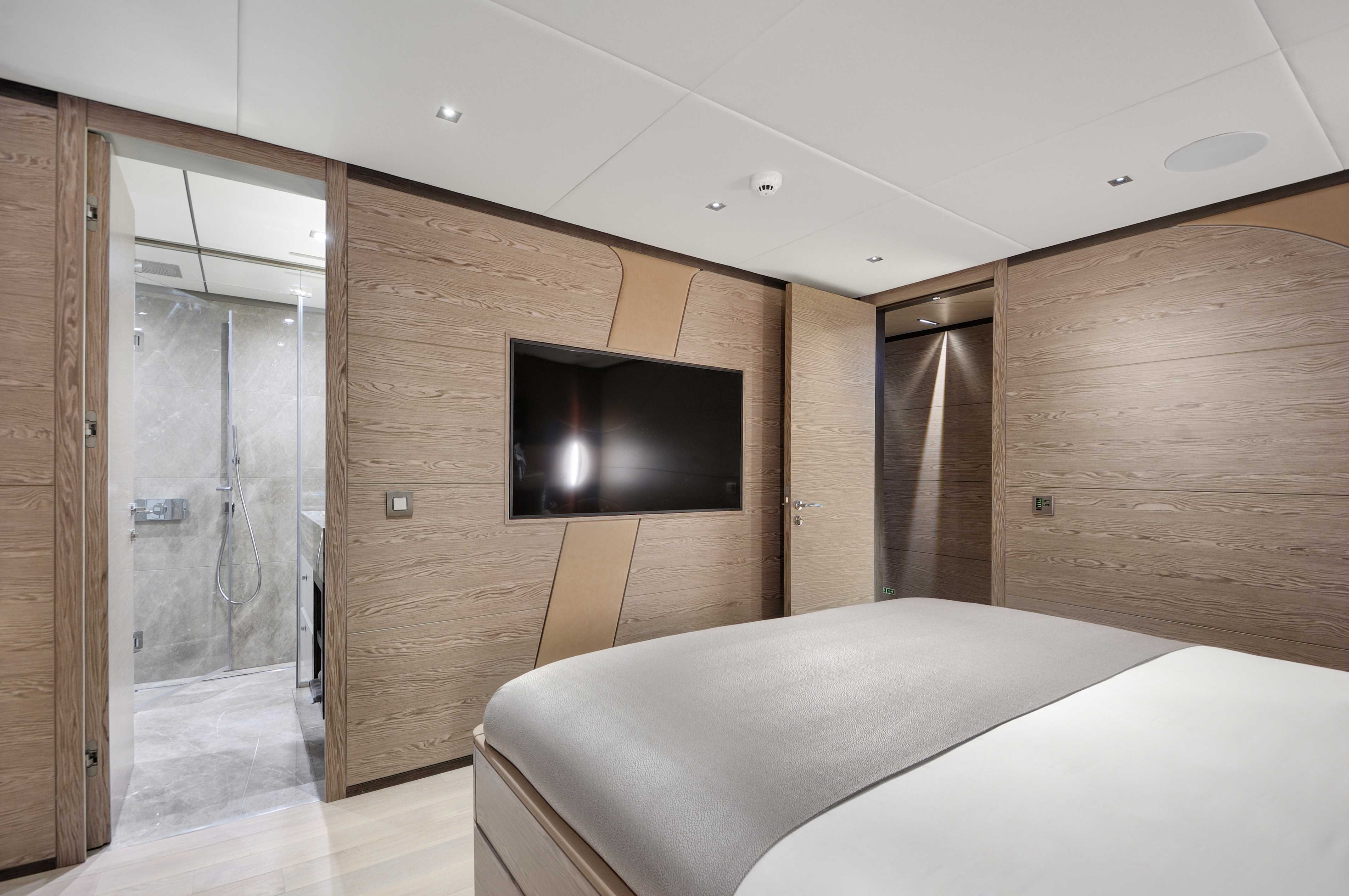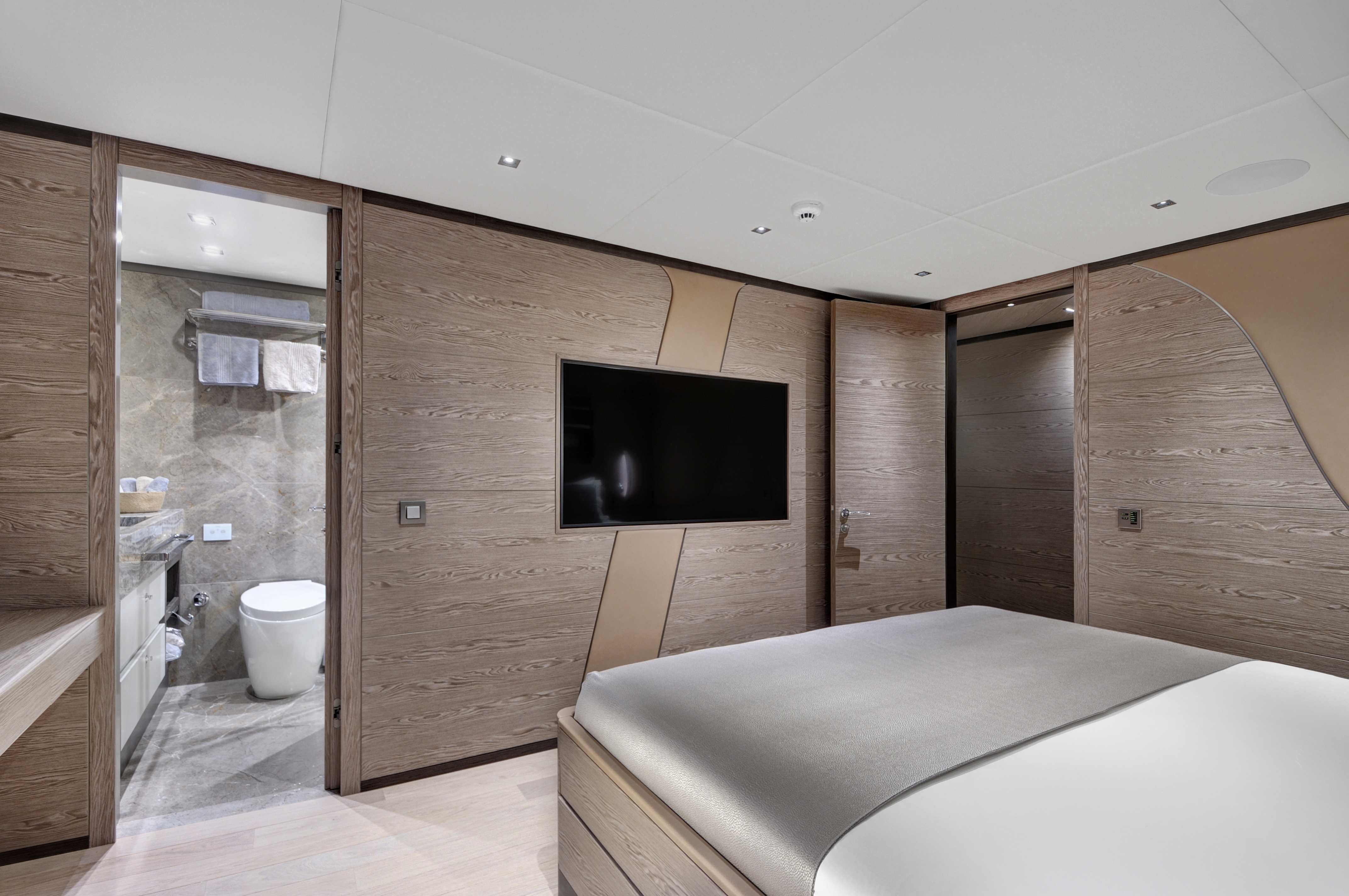 Onboard, six spacious cabins—including a full-beam master suite and generous VIP quarters—accommodate up to twelve guests in refined comfort. The main salon flows into the aft deck, with large windows and a thoughtful open layout that make the space feel bright and seamlessly connected to the outdoors. Guests will appreciate the clean design, high-quality finishes, and contemporary aesthetic that make it easy to relax or entertain.