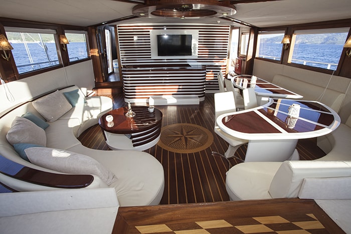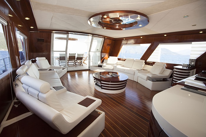The contemporary and stylish interior of Yacht Esma Sultan was the design work of Ali Riza Turan. The yacht contains fine, high-gloss woods throughout, complementing its supple white leather, soft furnishings and airy atmosphere. The spacious salon is home to plenty of seating, a full entertainment area, formal dining and a swank lounge. Surrounding panoramic windows ensure the salon and dining area have ample natural light and impeccable views.